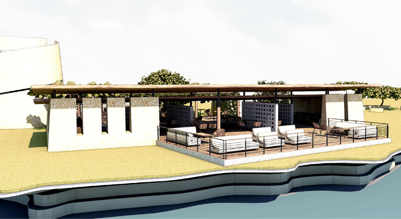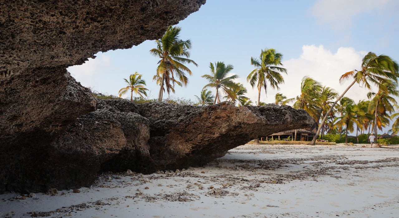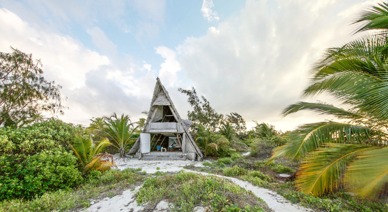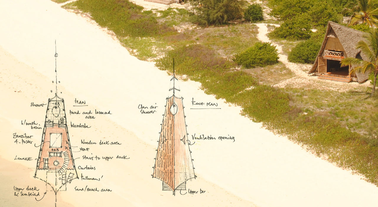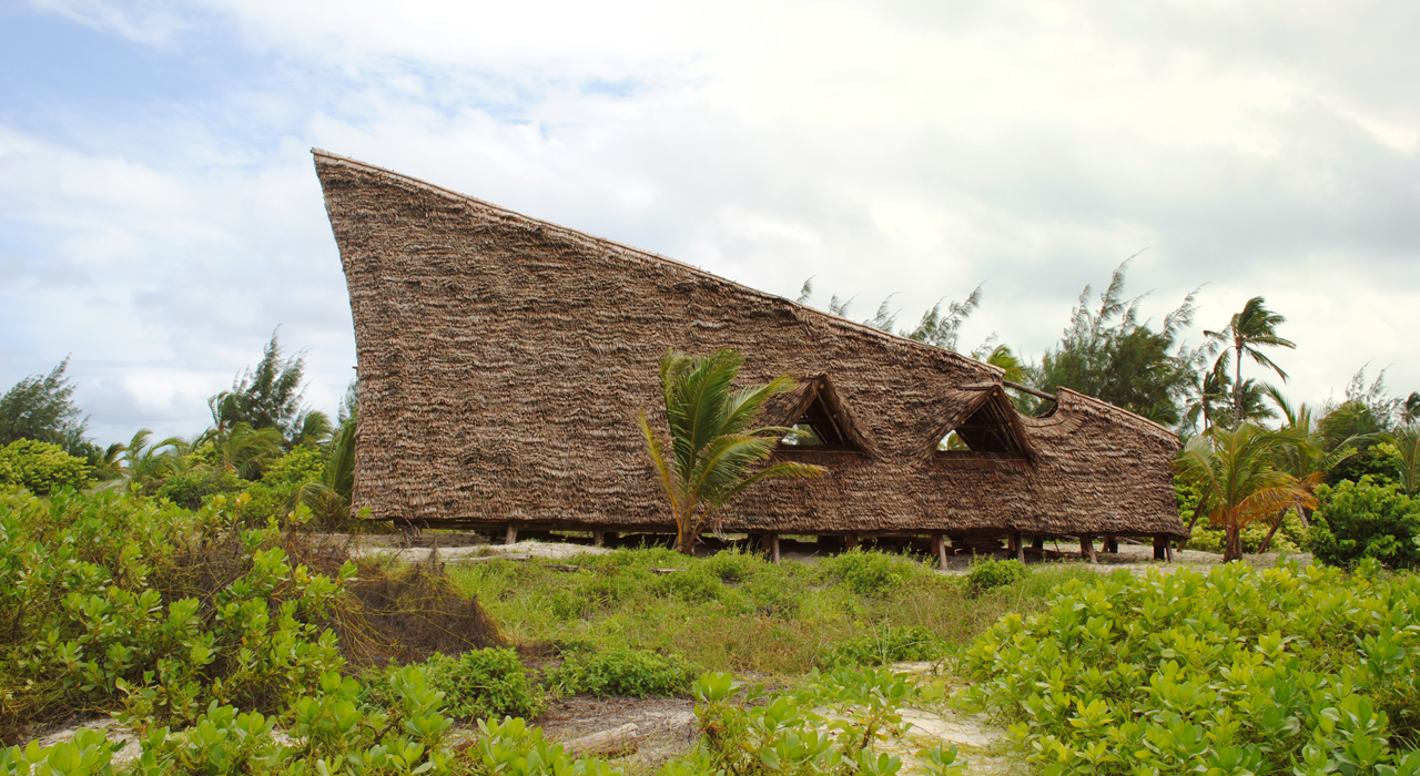 The bandas are conceived as stranded whales, with a partly exposed spine and a tented roof of makuti protecting the ground floor and the private balcony overlooking the sea. The planked floors are lifted to allow ventilation and prevent ingress of unwanted visitors such as the giant crabs and snakes thriving on the island. The front and back are open to air, with the roof flying over to protect against excessive sun impact and rain. Additional ventilation openings are created on the lateral sides to ensure optimal climatic conditions even during the hot days of January and February.