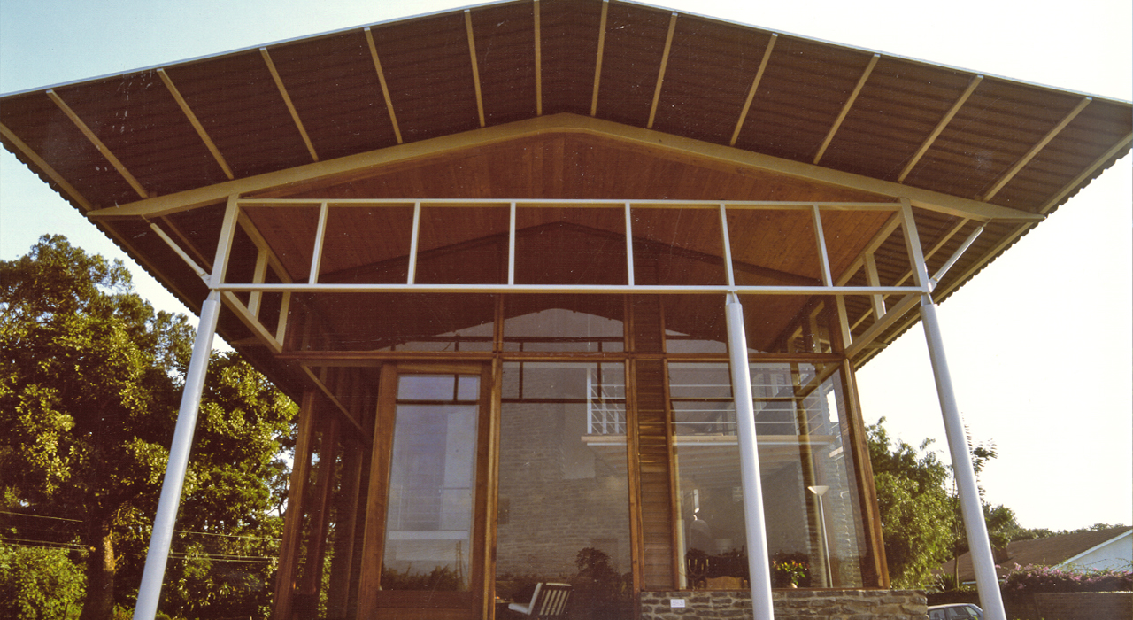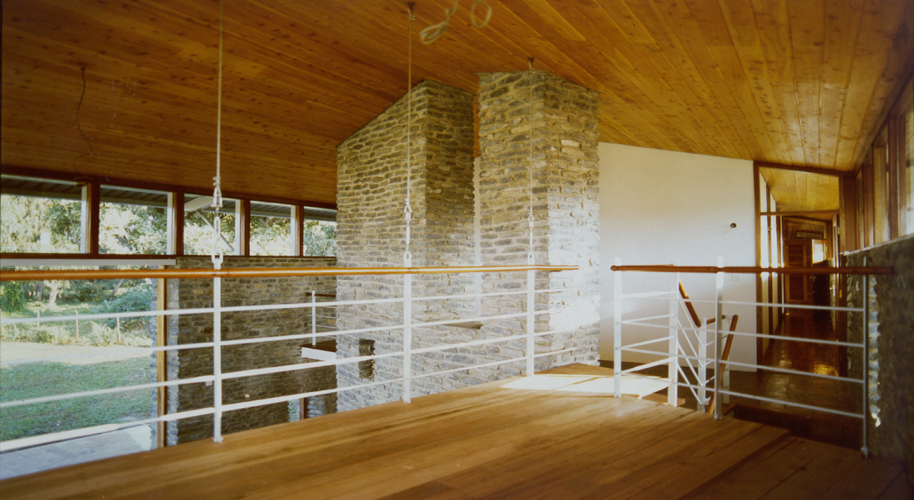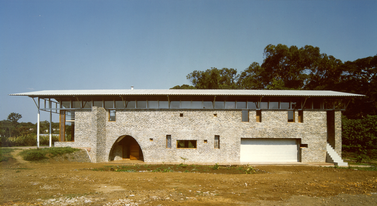 The curved roof is made out of corrugated sheets. The walls, erected out of natural stone from a quarry nearby, amount to 60 centimetres in diameter in order to be able to resist an earthquake. The house is kept together by a dominant steel structure, which makes the roof on top seem to float. The window openings which are carved deep within the natural stonewalls have been situated where the climatic conditions within the house demand for it.